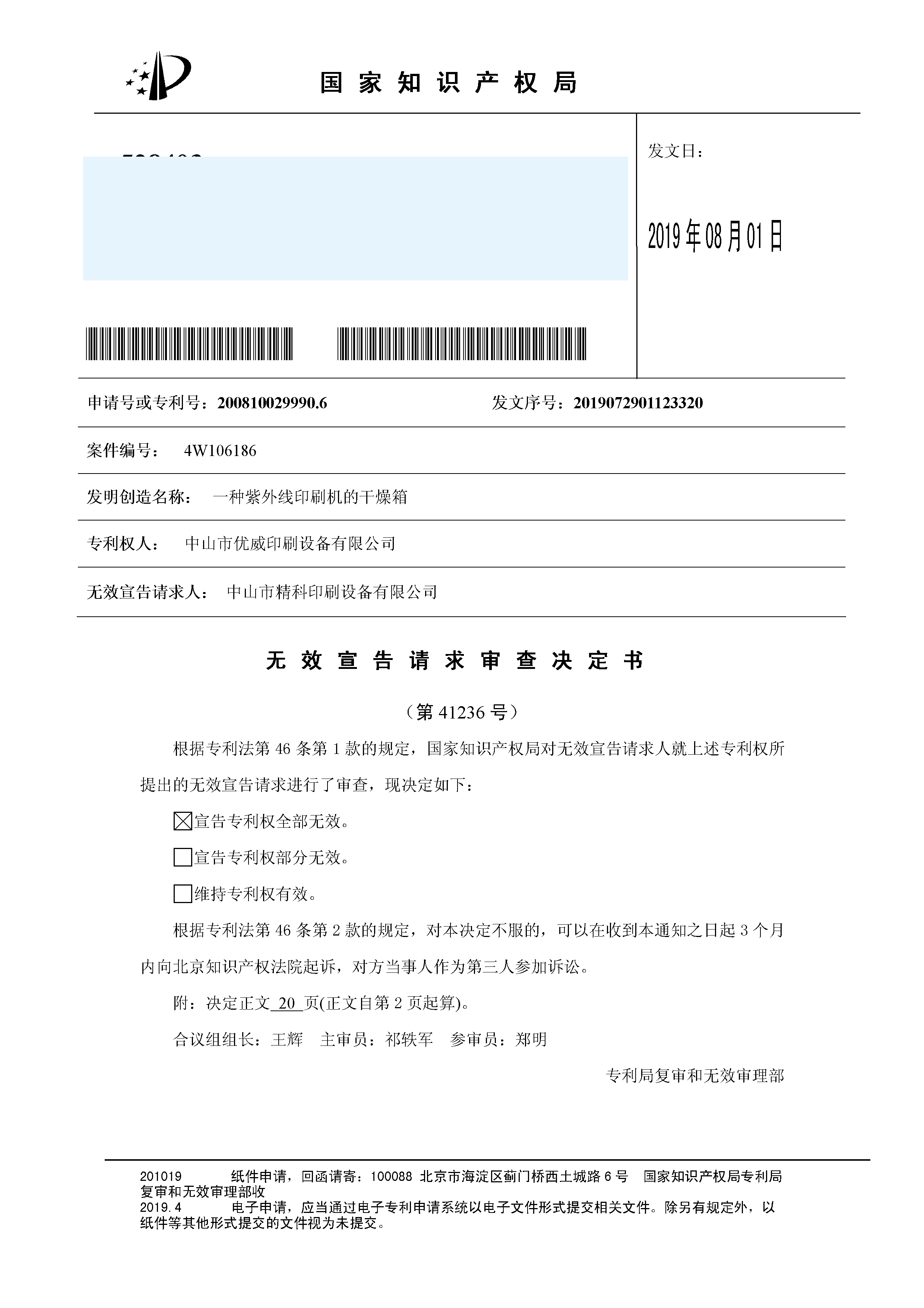 中山市精科印刷设备有限公司遭遇中山市优威印刷设备有限公司专利侵权诉讼迎来关键转折,8月1日、8月2日,国家知识产权局正式裁定中山市优威印刷设备有限公司诉中山精科两项专利无效。
